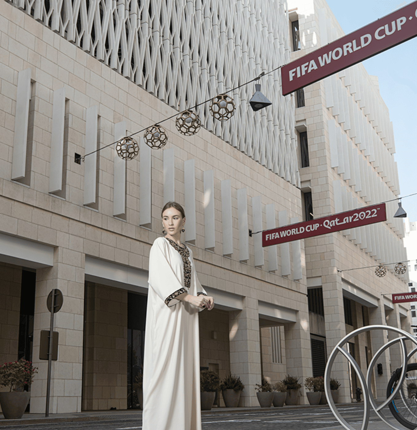 Set against the contemporary architecture of Doha’s urban landscape, this fashion editorial captures the intersection of culture, elegance, and modern design during the FIFA World Cup Qatar 2022. The styling embraces refined Middle Eastern craftsmanship, with intricate embroidery and flowing silhouettes that mirror the geometry of the city’s structures. The soft light and architectural lines frame the subject in balance — a dialogue between heritage and progress, fashion and place. This project celebrates modern Arab identity through fashion, blending timeless grace with the dynamic energy of a world stage.